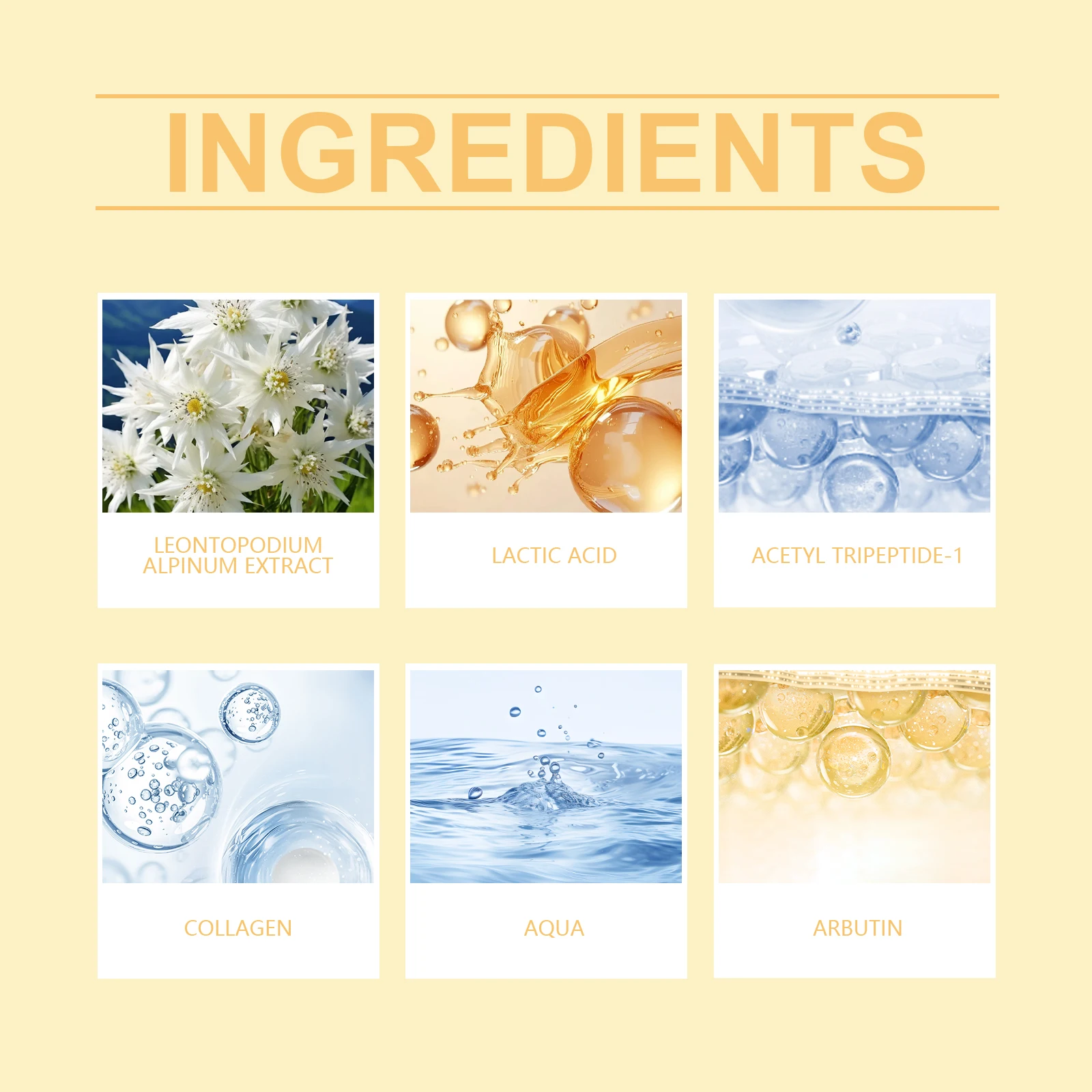 AQUA、LACTIC ACID、LEONTOPODIUM ALPINUM EXTRACT、COLLAGEN、ACETYL TRIPEPTIDE-1、ARBUTIN